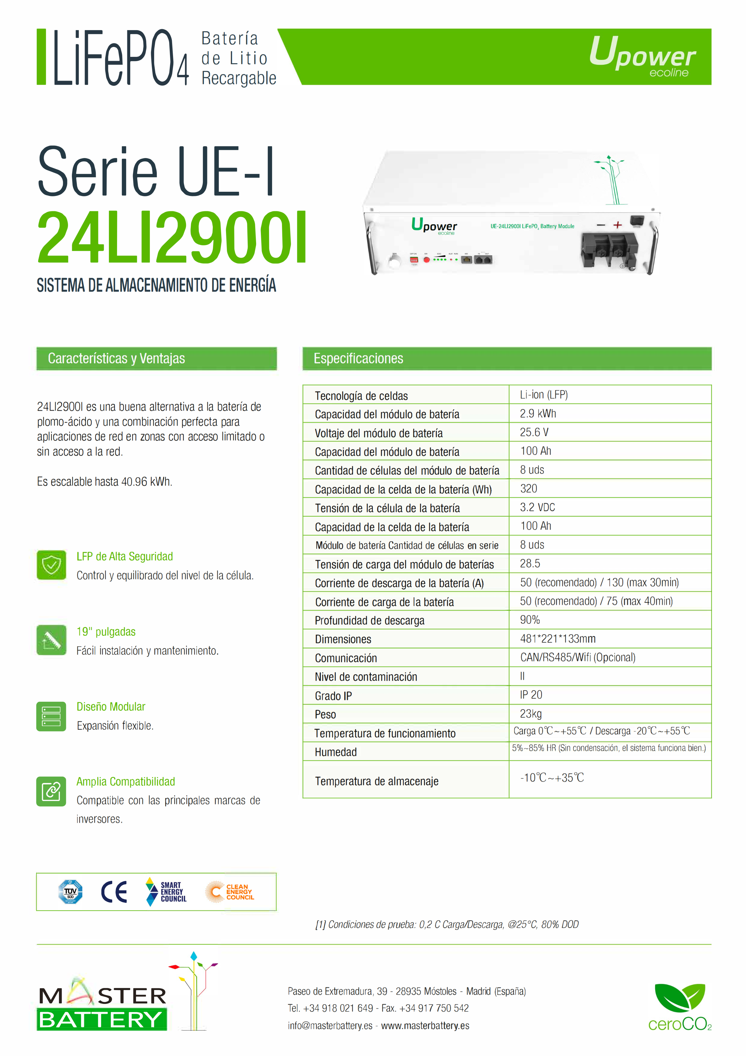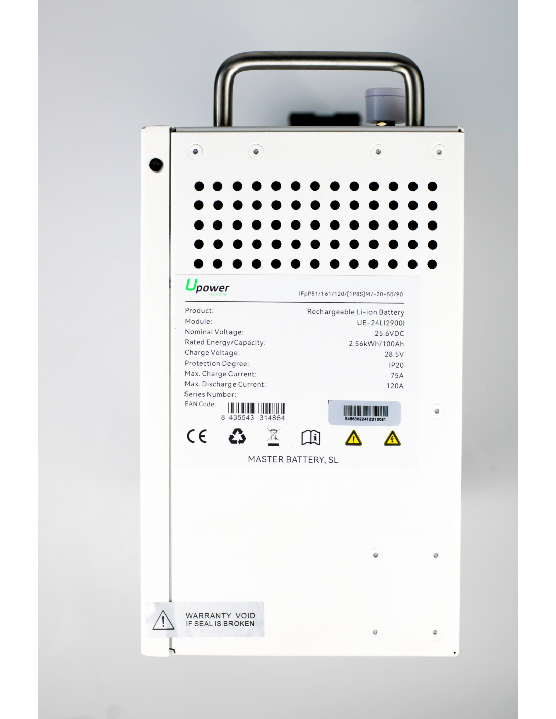 Las baterías U-Power UE-24LI2900I tienen la posibilidad de conectarse hasta 40 unidades en paralelo permitiendo sistemas de almacenamiento de hasta 96kWh.
