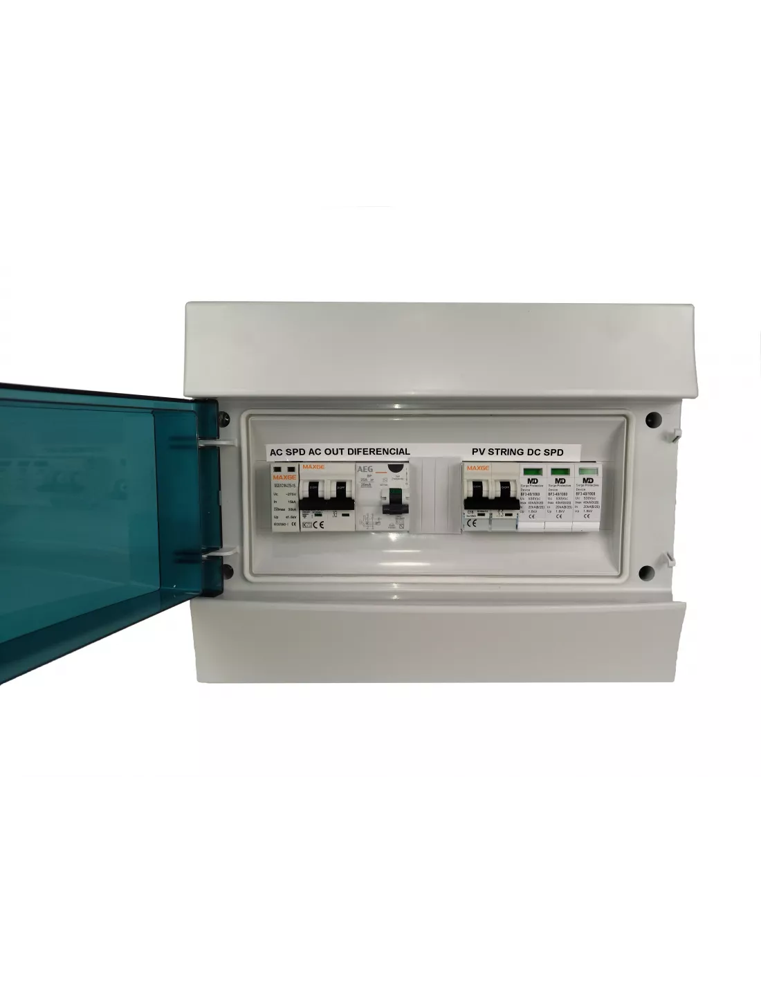 Cuadro de protecciones fotovoltaica de corriente alterna 25A monofásico y continua 2 Strings con sobretensiones en continua y alterna