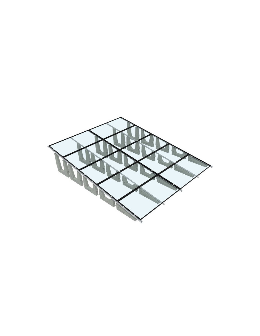 La serie VELA combina la simplicidad del bloque de hormigón con posibilidad de realizar conjuntos de paneles en varias filas y columnas. Es una solución perfecta para suelo o cubiertas donde el espacio es reducido y no es necesaria mucha inclinación. Dispone de tres posibilidades de inclinación ya que tiene el modelos de 15º, de 10º y de 5º. En función del ángulo de inclinación se podrá realizar más filas de paneles en posición horizontal. De esta forma tenemos las siguientes posibilidades: