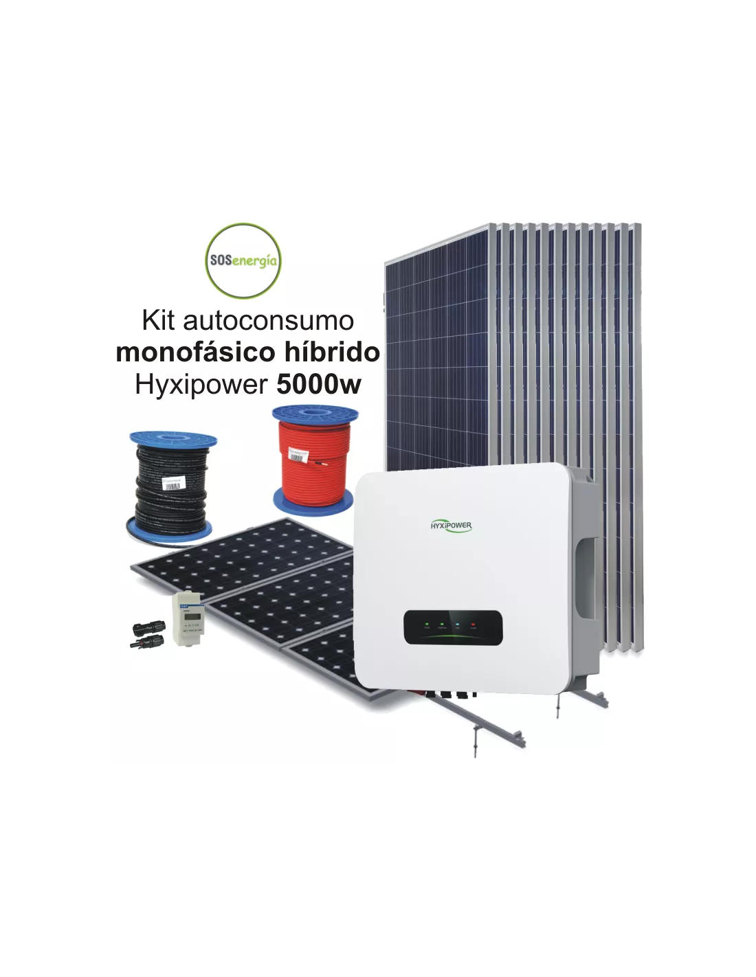 El kit híbrido de autoconsumo solar HYXiPOWER de 5000W, capaz de producir una media diaria de 23250 wh/día (*), incluye: