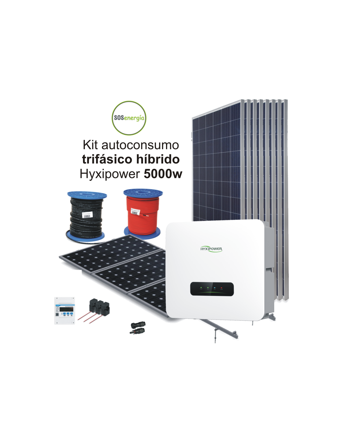 El kit híbrido trifásico de autoconsumo solar HYXiPOWER de 5000W, capaz de producir una media diaria de 23250 wh/día (*), incluye: