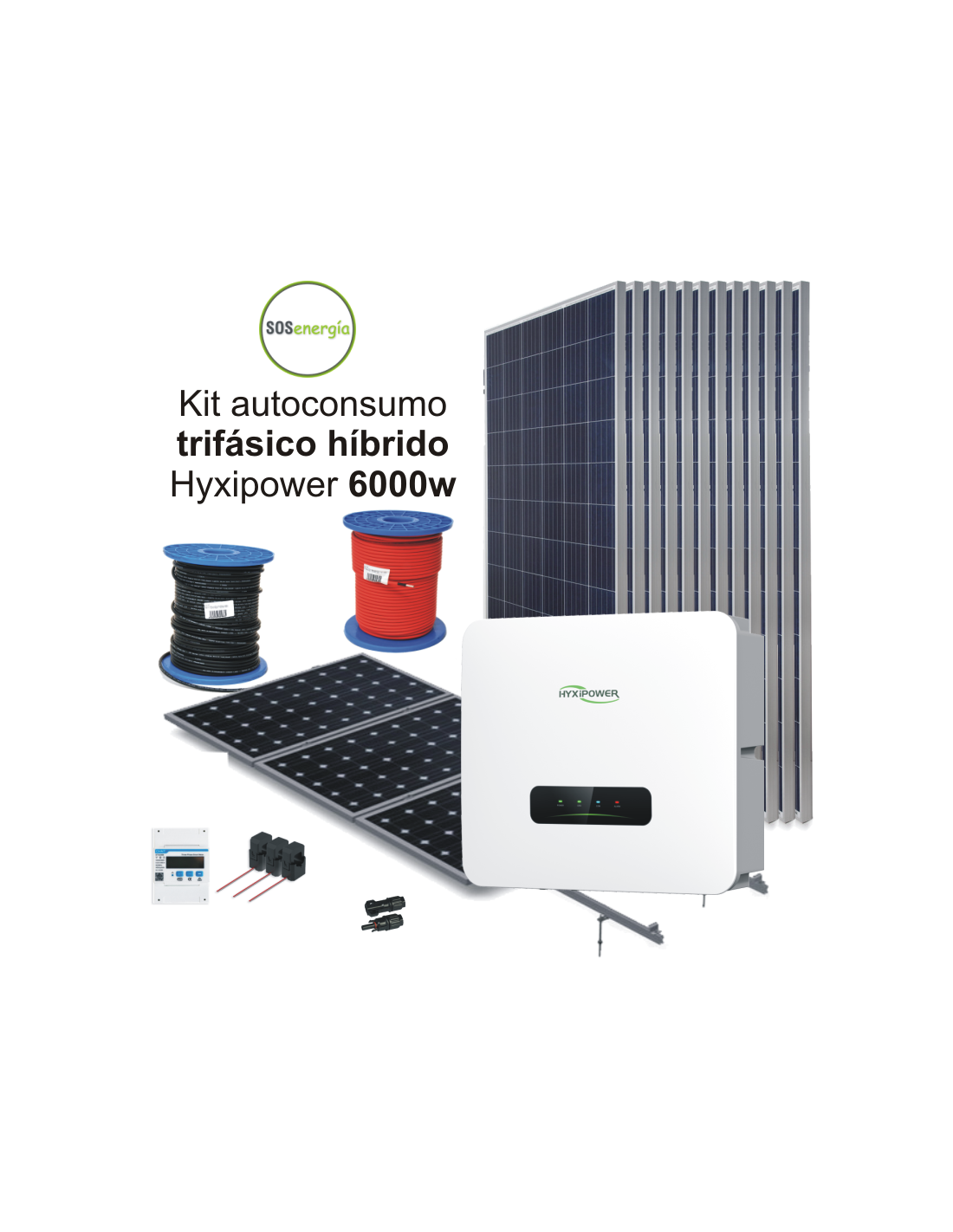 El kit híbrido trifásico de autoconsumo solar HYXiPOWER de 6000W, capaz de producir una media diaria de 29600 wh/día (*), incluye: