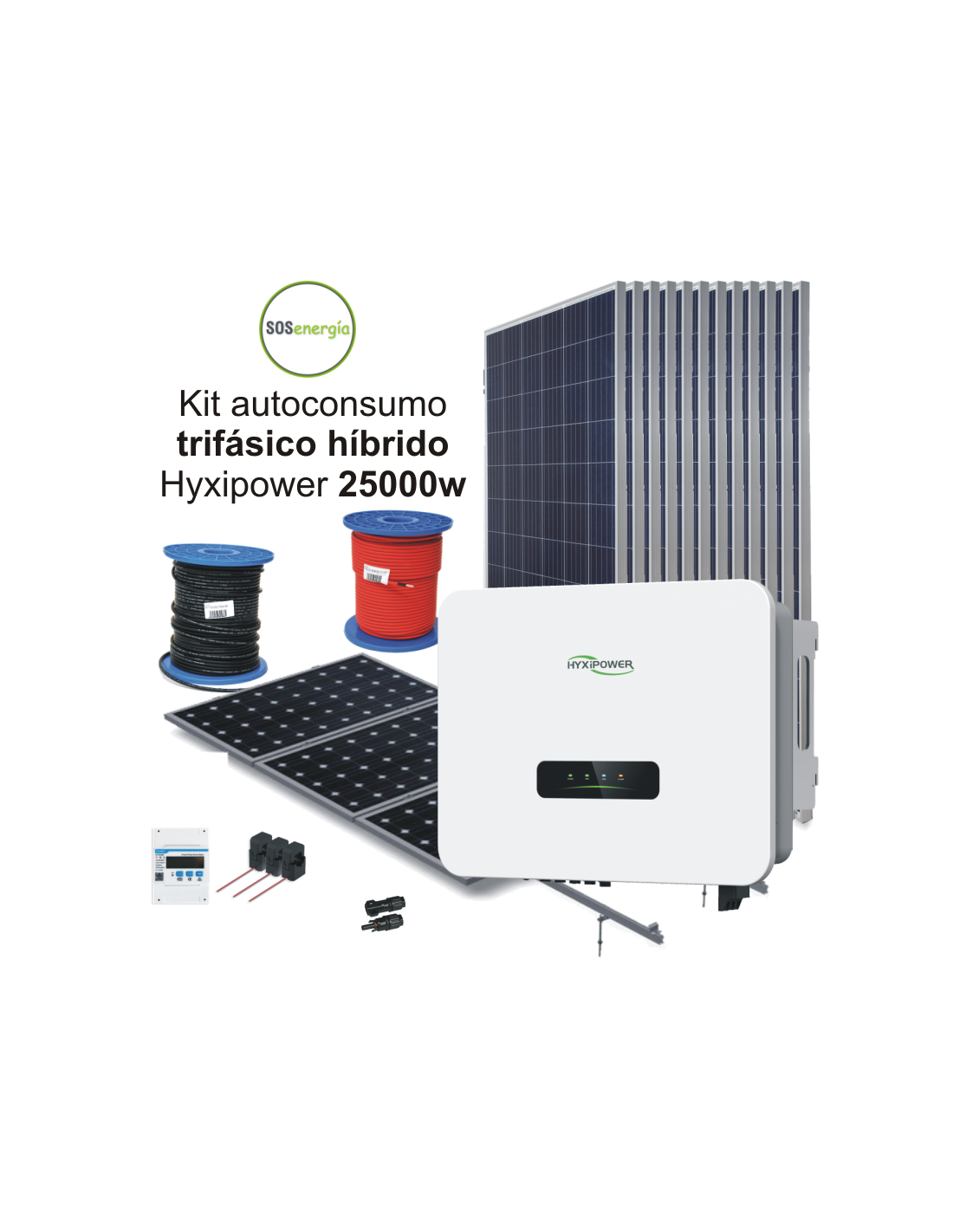 El kit híbrido trifásico de autoconsumo solar HYXiPOWER de 25000W, capaz de producir una media diaria de 110000 wh/día (*), incluye: