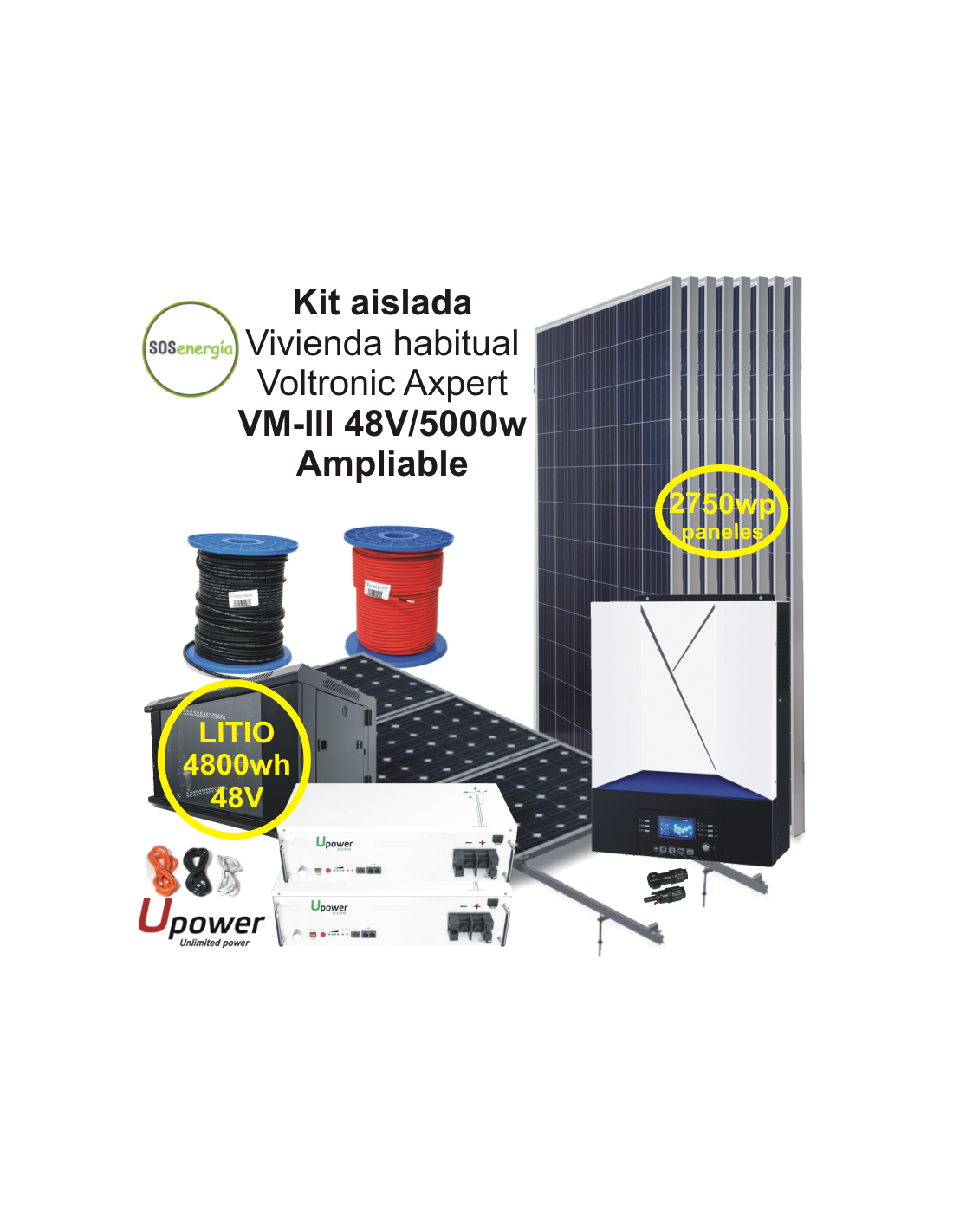 El kit de solar de aislada Voltronic Axpert de 5000W es capaz de producir una media diaria de 12000 wh/día (*). El kit Incluye: