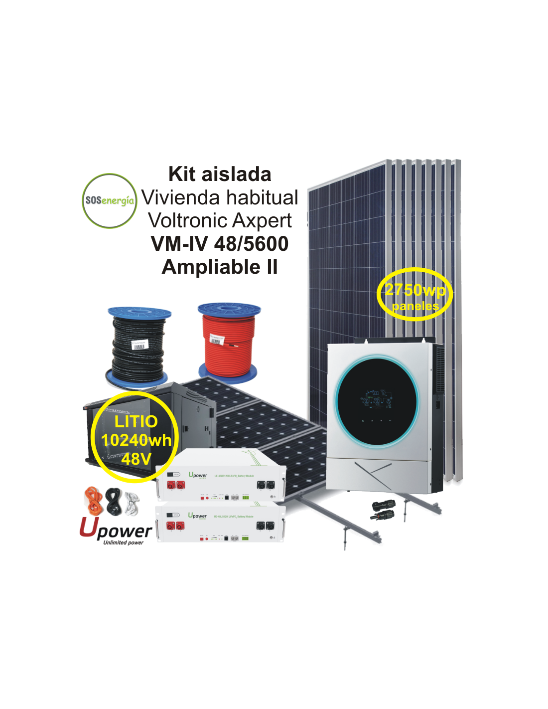 El kit de solar de aislada Voltronic Axpert de 5600W es capaz de producir una media diaria de 12000 wh/día (*). El kit Incluye: